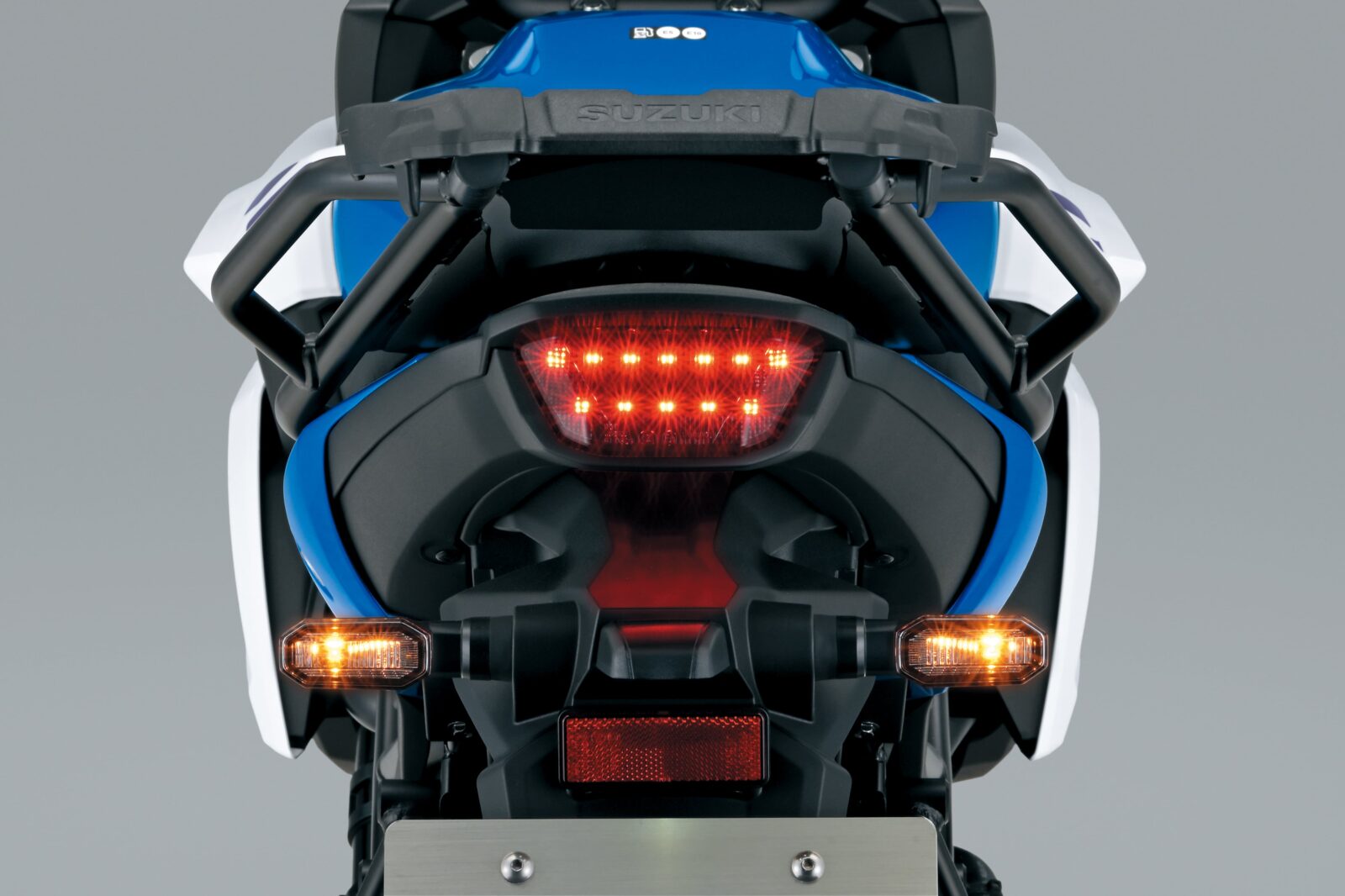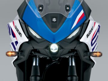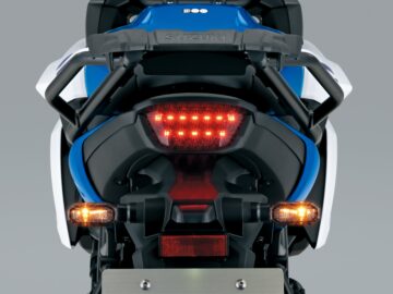 De nieuwe Suzuki SV-7GX verschijnt in drie kleuren: Pearl Brilliant White / Metallic Triton Blue, Pearl Matte Greige met rode accenten en Glass Sparkle Black met blauwe details.