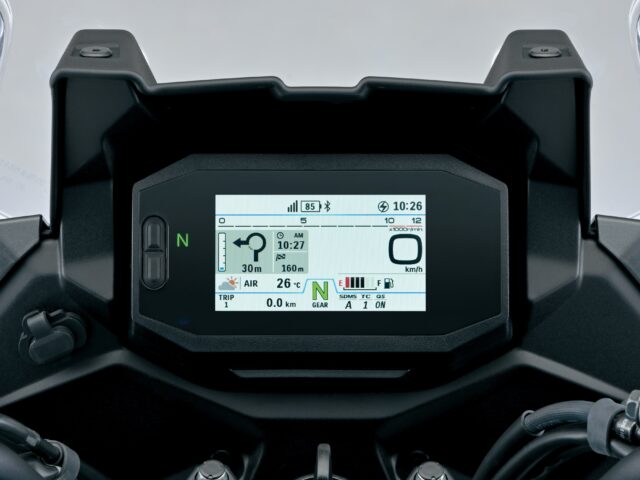 Het 4,2-inch full-color TFT-display biedt helder overzicht over alle functies, inclusief rijmodi en tractiecontrole. Via Bluetooth is het scherm te koppelen aan een smartphone met de Suzuki Ride Connect+ App, waarmee onder meer turn-by-turn navigatie, meldingen en weersinformatie worden weergegeven.